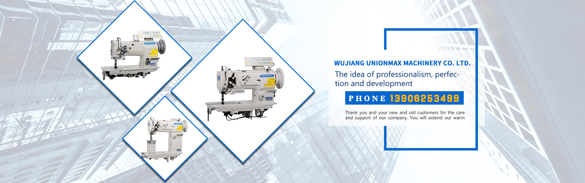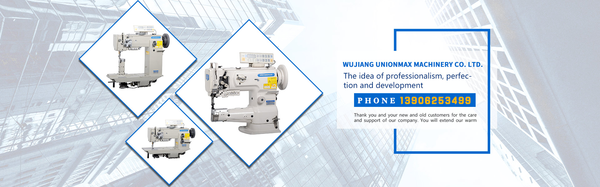 Wujiang unionmax machinery co. ltd.is a development, manufacturing, marketing, service in one of the modern enterprise. Adhering to the core concept of "gathering essence and creating fine quality", we should actively aim at the advanced technology of the international sewing machine industry, develop innovation, provide customers with efficient, reliable and practical sewing machine product series, adopt advanced process lean production, carry forward the enterprise spirit of "pragmatic innovation", and be the country of excellent brand. The stratagem is rising. Adhering to the "humanized, scientific and technological" management model....